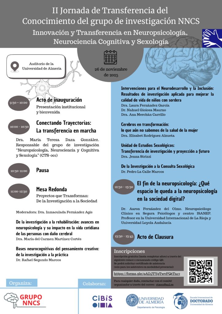 La jornada concluirá con la conferencia del Dr. Aarón Fernández del Olmo, destacado especialista en Neuropsicología Clínica, quien ofrecerá una interesante ponencia sobre cómo la Neuropsicología ha ido configurándose a lo largo de la historia, aportando valiosos avances al conocimiento científico y enfrentando hoy un posible punto de inflexión ante el rápido desarrollo de los procedimientos digitales.